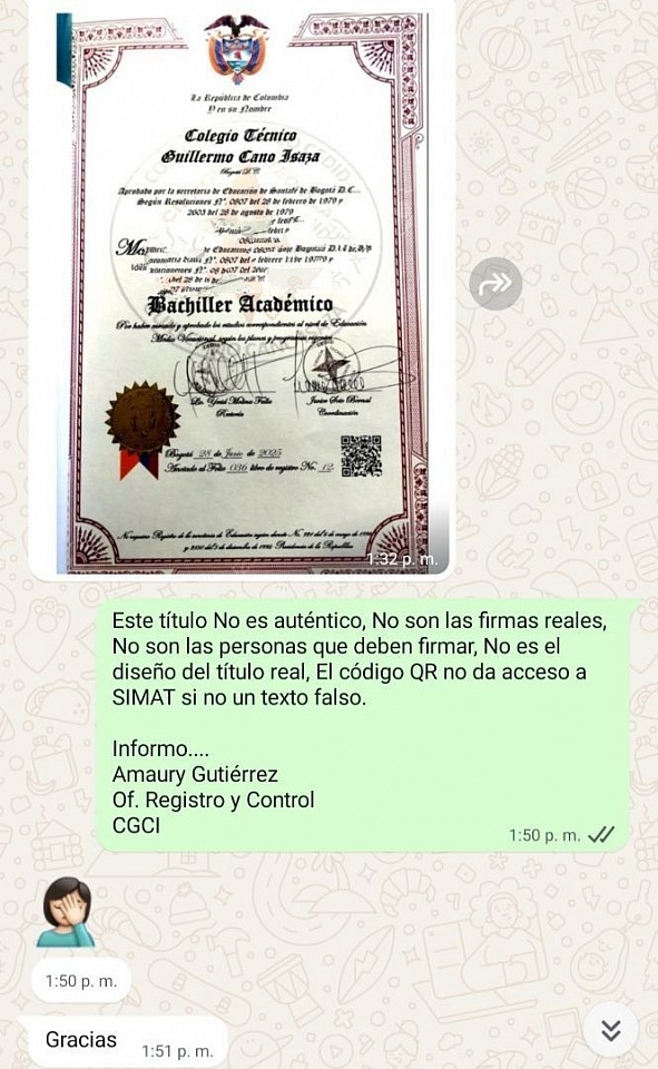 Personas inescrupulosas usando la Información e Identidad de nuestra Institución, están engañando a personas por redes sociales y vendiendo diplomas a valores de 180.000 pesos.